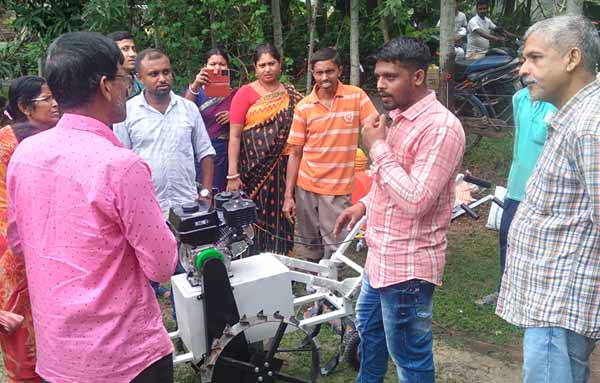 Demonstration of mini tiller, sprayer and seed drill machines done at Hingalganj on 19th Oct'24. Group members, Seed bank members and field staffs were present. Mr. Kiran Dhotre, representative from Niyo Farmtech facilitated the demo sessions. Depending upon the soil characteristics (clayey soil) the mini tiller machine needs to be updated. The battery operated sprayer with long pipes is helpful to spray botanical pest repellents and liquid manures. The seed drill machine is useful in planting of various seeds, like leafy vegetables, pulses, cereals etc. Follow up will be done for finalizing rules and regulations for using this tools through seed banks. |